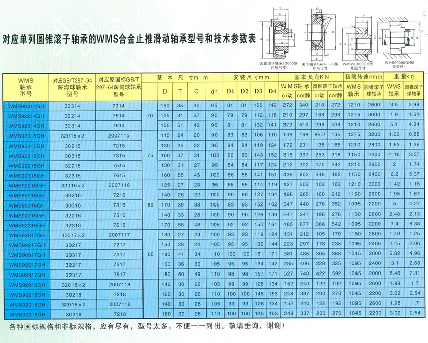 對(duì)應(yīng)單列圓錐滾子軸承的WMS合金止推滑動(dòng)軸承型號(hào)和技術(shù)參數(shù)表